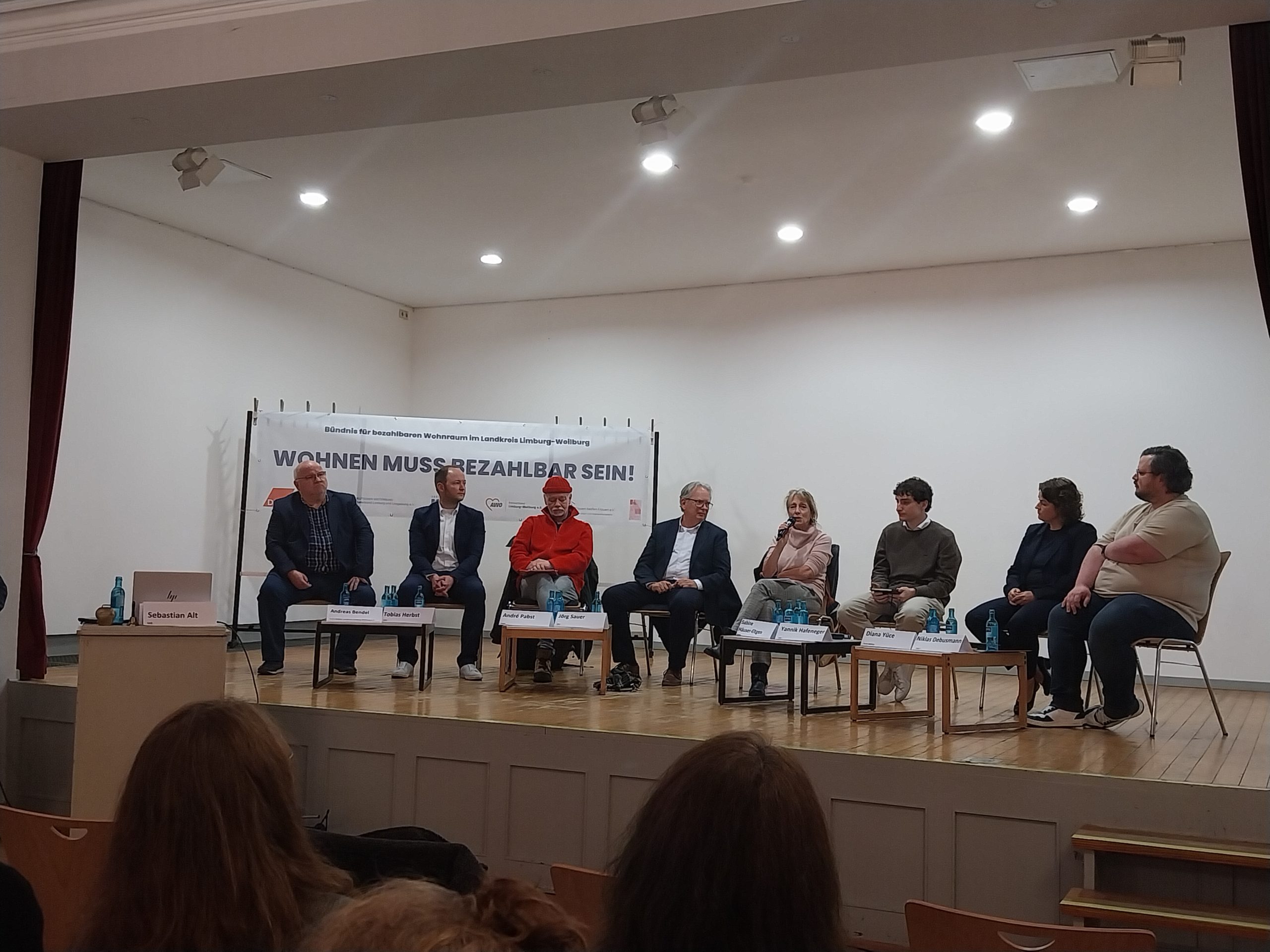 Das Bündnis für bezahlbaren, barrierefreien Wohnraum im Landkreis Limburg-Weilburg hat am 26.Februar Vertreter von Parteien und Gruppierungen, die zur Kommunalwahl kandidieren, zu einer Podiumsdiskussion eingeladen. 8 Kandidatinnen und Kandidaten sind der Einladung ins Kolpinghaus nach Limburg gefolgt. Nachdem reihum innerhalb von 2 Minuten zu vorbereiteten Fragen Statements abgegeben wurde, konnten die 2 Vertreterinnen und Vetreter in 2 Sätzen zusammenzufassen, warum sie gewählt werden sollten. Danach folgte eine Runde mit Fragen aus dem Publikum. Ein großes Thema war die Frage, ob eine kreiseigene Wohnungsbaugesellschaft oder Genossenschaft Lösungen für die Vielzahl an Problemen bringen könnte. 7 der 8 Protogonisten erzeugten den Eindruck solche Lösungen unterstützen zu wollen. 2 der bereits im Kreistag vertretenen Parteien gaben an bereits entsprechende Anträge eingebracht zu haben. Bisher seien solche Anliegen aber an ablehnenden Mehrheiten gescheitert.Unter der Annahme, dass die konservativste Partei bei der anstehenden Kommunalwahl keine absolute Mehrheit erreicht, macht die vorgetragene Zustimmung der restlichen Vertreterinnen und Vertreter Hoffnung auf einen wesentlichen Fortschritt bei diesem Anliegen.Funktionieren kann es jedoch nur, wenn Städte und Gemeinden dies unterstützen und sich aktiv beteiligen. Da das Baurecht den Kommunen obliegt und Bauland oft in deren Eigentum ist, wäre mit deren Zutun ohne Weiteres Fördermaßnahmen für ausreichenden, bezahlbaren, und barrierefreien Wohnraum möglich. Denkbar sind auch Quoten für Bauträger um entsprechenden Wohnraum entstehen zu lassen. Wenn es sich nicht nur um Wahlkampfgetöse sondern um ehrliche Anliegen handelt, lässt sich was erreichen.